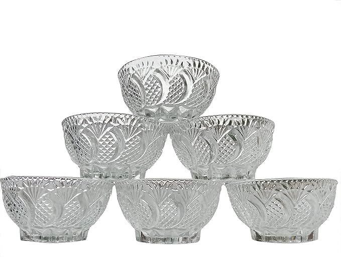 Elevate your dining experience with this Glass Bowl Set of 6, designed in a charming Royal Flower pattern. Each 120 ML transparent crystal bowl offers exceptional clarity, making your table setting look elegant and refined. Crafted from premium-quality glass, these katori bowls are perfect for serving desserts, chutneys, salads, dips, snacks, and daily meals. Their durable build ensures long-lasting use, while the smooth finish adds a touch of sophistication to every occasion. Whether for home dining, festive serving, or gifting, this premium glassware set brings beauty, functionality, and style to your kitchen collection.